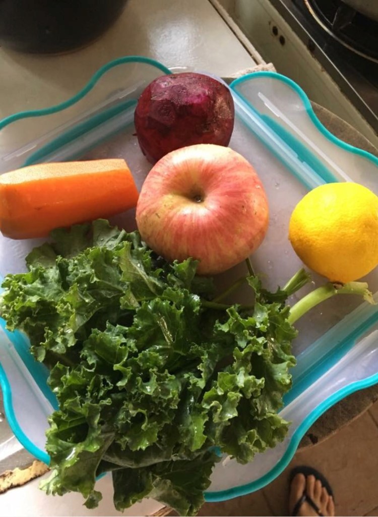 雨衣甘藍、紅菜頭、紅蘿蔔、萍果、檸檬,排毒早餐