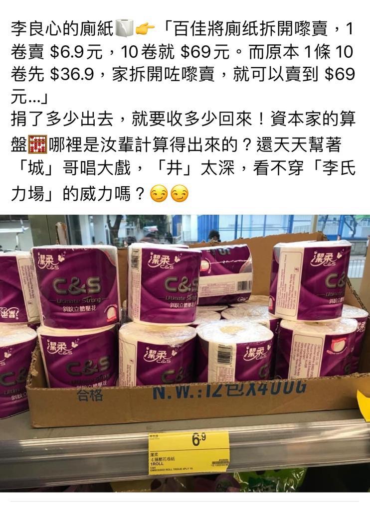 有人邏輯是⋯ 以前超市買$80貨品,送一卷廁紙,所以廁紙唔應該咁貴? 這個是假圖,因為之前廁紙係送!