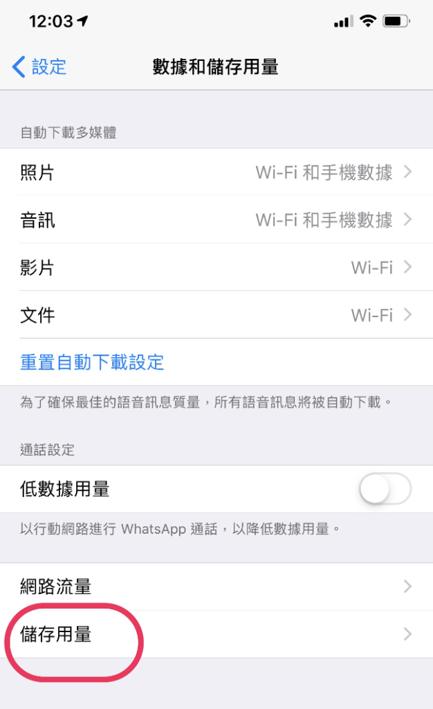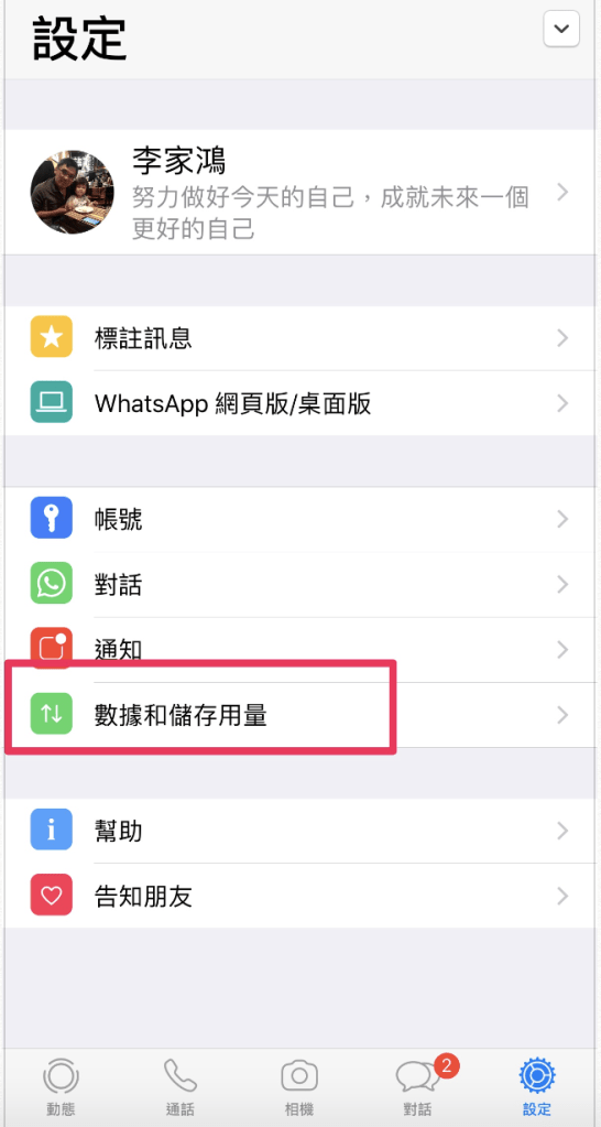 第一步:點一點在WhatsApp齒輪,在[設定]一版看到數據和儲存容量