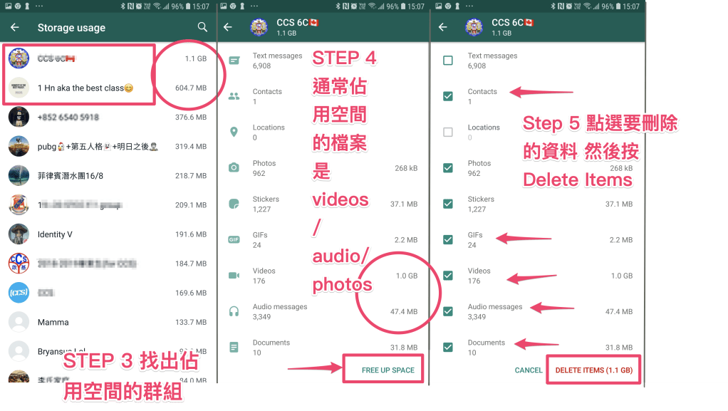 可以按個別群組刪除一些較佔容量空間的視頻、圖片之類。