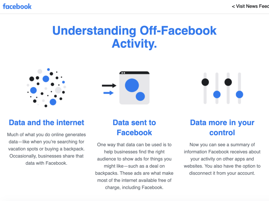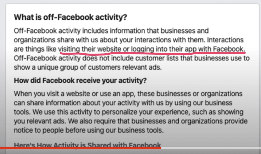 Off-Facebook Activity 是Facebook使用你的數據的一種方式,其目的是幫助企業找到合適的受眾,以展示您可能想要的東西的廣告,例如你在瀏覽網站是你曾經點擊過的產品和交易。這些廣告使包括Google好Facebook在內的大部分互聯網免費提供他們的服務。