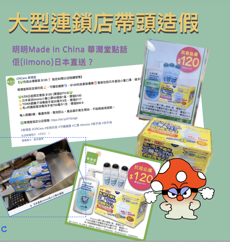 大型連鎖店帶頭造假 分類:家鴻2020 年 05 月 16 日發表於生活逸事 最近華潤推出一款 “日本" 口罩,又有兒童款式。到底 iimono 有冇出過口罩? 點解兒童口罩可以唔用鐵線?明明Made in China 華潤堂點話佢(iimono)日本直送 ?😉😉🤦🏻♂️ # 信佢 CRCare 咋 評分:分享此文: 分享到 WhatsApp(在新視窗中開啟) WhatsApp 喜歡 正在載入... 發表者:家鴻 過去工作多年,在專上學院當一個電腦系統分析員,公餘時間會多關注自己的興趣和生活,多關心身邊和朋友,努力進修健康飲食、營養及自然療法的知識。 檢視更多文章