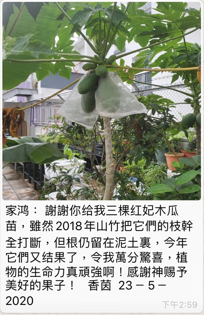被山竹劈掉的木瓜 分類:家鴻2020 年 05 月 24 日發表於生活逸事,價值觀 生命自己能找到蓬勃之路。 人誰沒有風浪,這個木瓜樹是幾年前送給一間小學,經歷山竹本來是捱不過,被颱風劈掉我還跟老師說,應該救不掉,大家想看看今日它的模樣嗎? 生命力的頑強。 評分:分享此文: 分享到 WhatsApp(在新視窗中開啟) WhatsApp 喜歡 正在載入... 發表者:家鴻 過去工作多年,在專上學院當一個電腦系統分析員,公餘時間會多關注自己的興趣和生活,多關心身邊和朋友,努力進修健康飲食、營養及自然療法的知識。 檢視更多文章