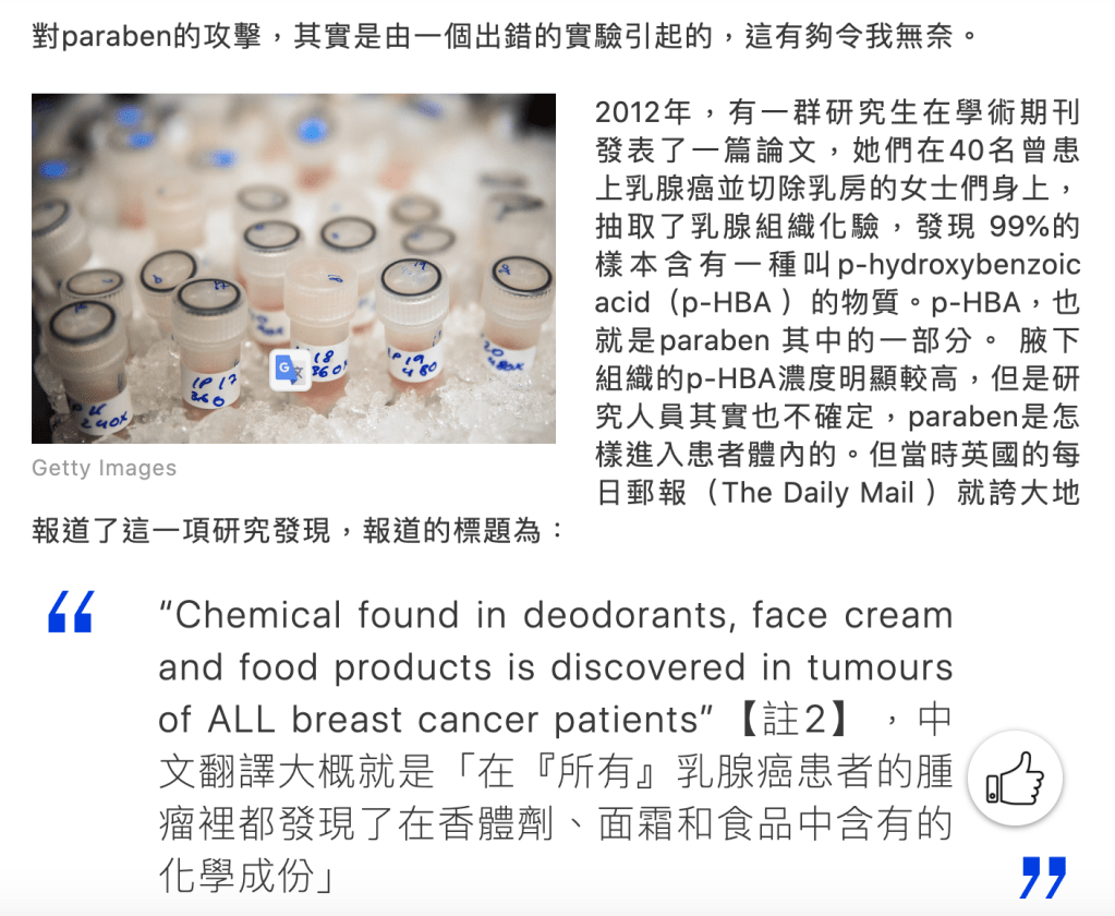 這位參與2004 study的P. Darbre在Journal of Applied Toxicology回應關於parabens 及癌症的關聯,他清楚地指出「Parbens並不會造成乳癌!」。而事實上許多國際級研究都發現Parbens 可以被人體分解、代謝、排泄掉,亦不會對人體造成任何傷害!之後有很多研究,一次又一次證實paraben和乳腺癌並沒有直接關係,但是媒體們都看不見、不報道了。安全的成分,是不是就不值得認真報道呢?社會也沒有人關注了嗎?還是該媒體覺得不需要為他們之前誇大的報道作出澄清呢? 這真的讓人非常費解。