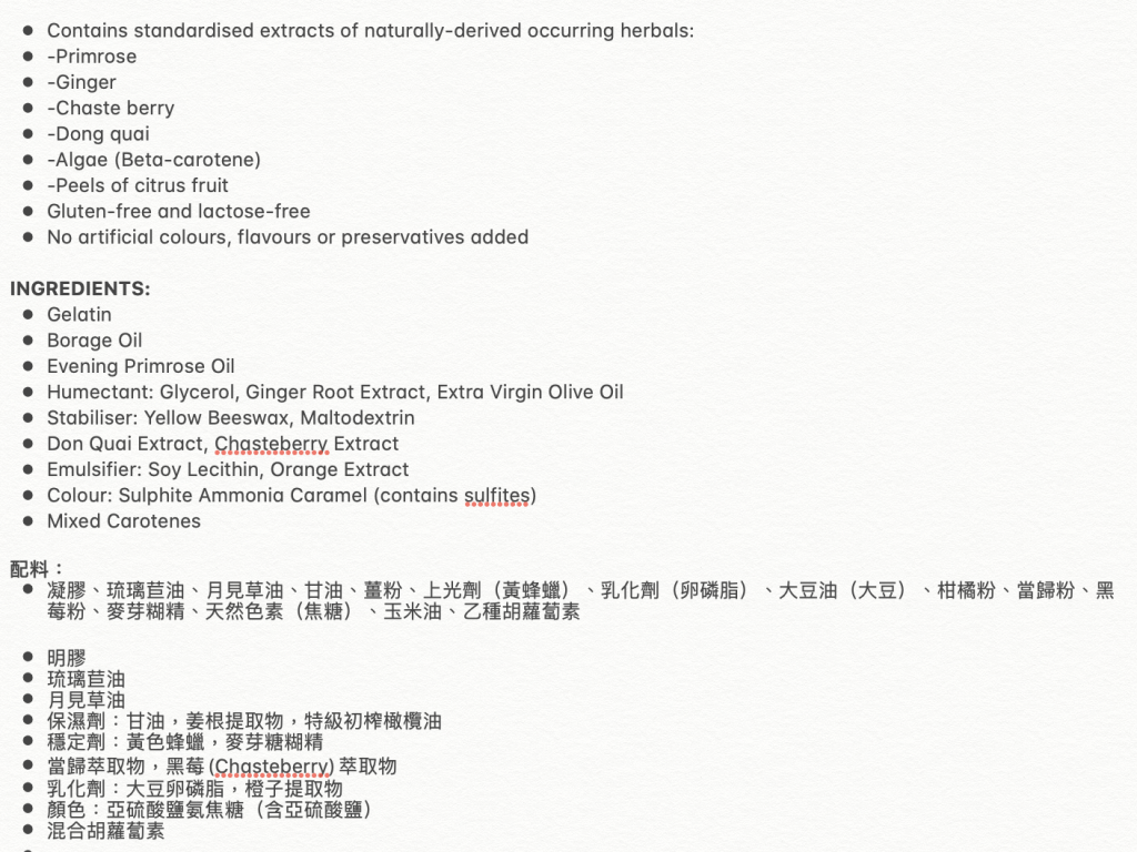 這間營養補充品公司,擁有最先進配方,他蘊含的成份除了月見草,就是流璃苣,及薑的根部卒取物以及特級初榨橄欖油和當歸。成份表用的Borage 有可能就是到手香這類植物 ! 這張相片是客戶給我,回饋對她的經痛效果顯著!