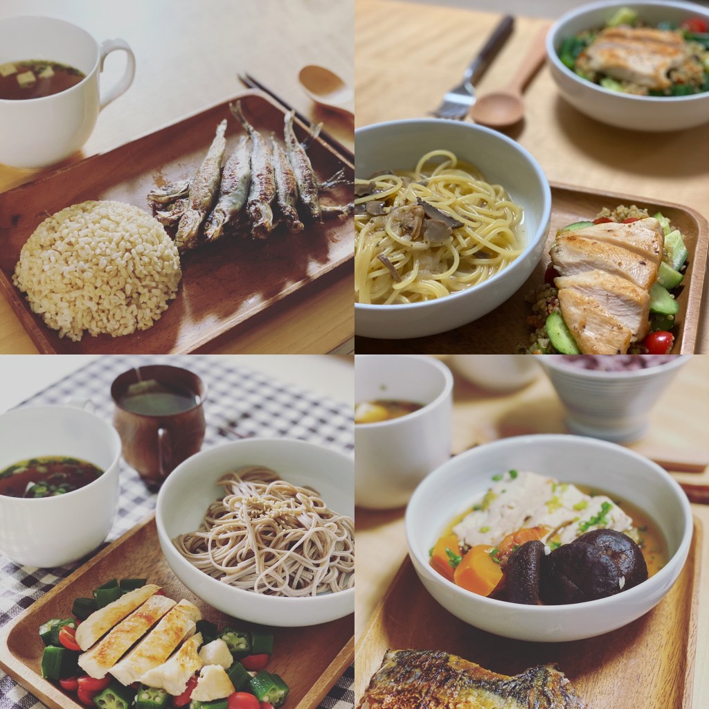 午/晚餐則會以糙米飯、烏冬或蕎麥麵作主食;配一種肉類,肉類可以是豬、牛、雞或魚;再加上不能缺少的蔬菜,我最常煮的是炒雜菜,因為一次可以吃到不同顏色的蔬菜。一頓基本的午餐/晚餐便完成,豐富而營養均衡。