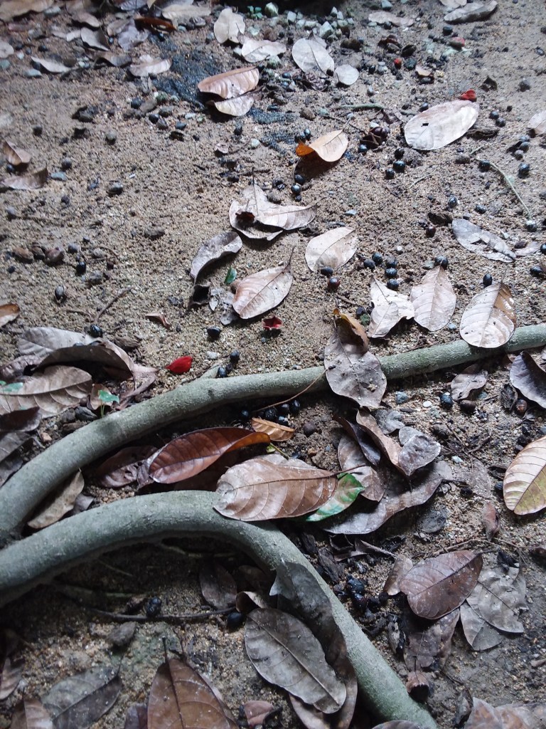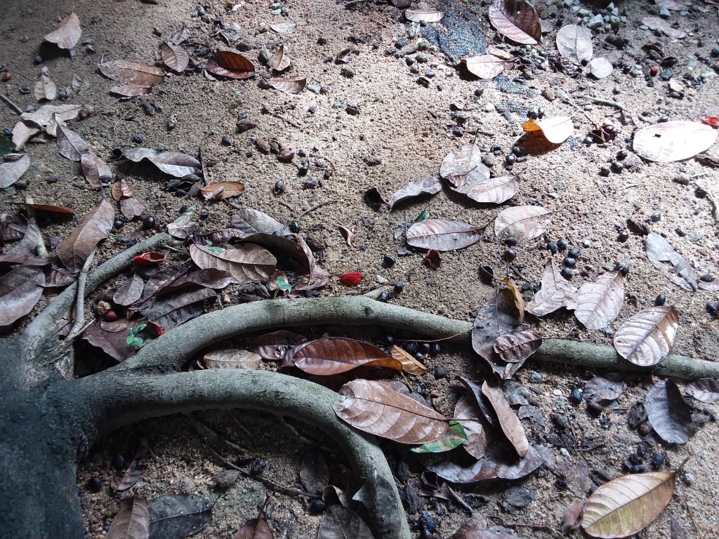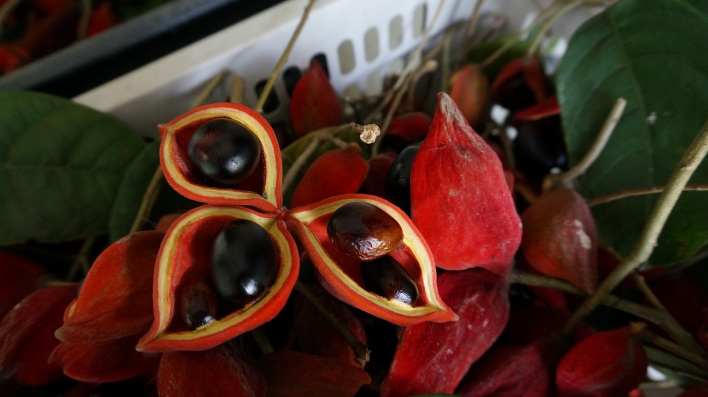 可貴的是,我確實是第一次於幾天前,在上班的地方親眼看見鳳眼果在大樹上高高吊掛著,部份更懸吊半空中,景色奇特,好像探險家一樣,發現新事物,旅程不斷,心情保持驚奇感。而大樹下的地上,滿地都是一粒一粒的黑色種子,那種子便是從樹上掉落下來的「鳳眼果」。那奇妙的經歷永存在心中,成為另一個有趣又美妙的回憶。