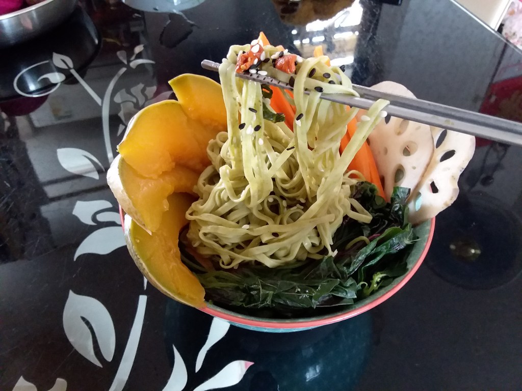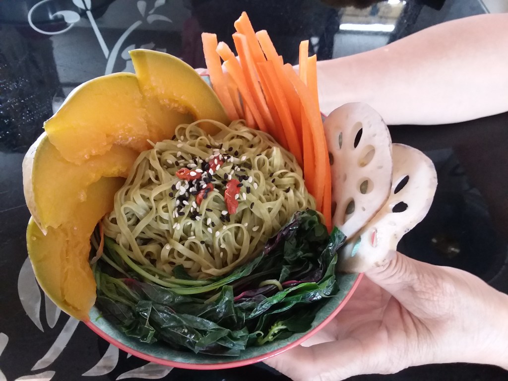菠菜杞子麵拌色彩繽紛的配菜,有蓮藕及甘荀,當然少不了自家種的南瓜和紅莧菜,配上清新風味湯底,加上少許黑白芝麻,帶出淡淡的清香,味道更妙不可言。