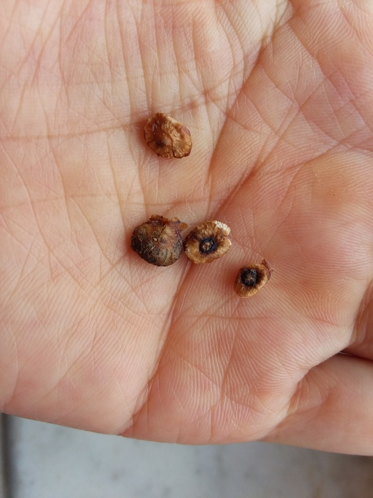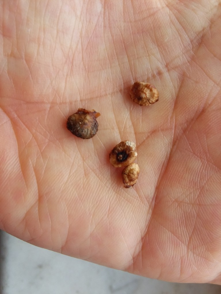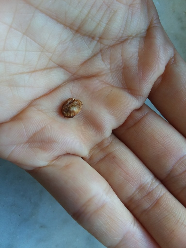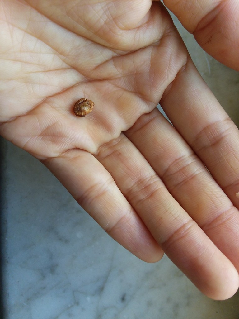 最初的一次是上個月,當時的我食用朋友家鴻所贈送予我的香港本地的牛奶蕉。當我吃下香蕉後,慢慢咀嚼,享受香蕉甜味的時候,突然,感覺口腔內有一粒小小的硬塊,於是我把它吐出來,看後感到驚訝的同時,心中又感到疑惑,我抱着探索的心情,不停思考及研究它們,慢慢開始感覺它們可能真的是香蕉的果核,腦海中充滿很多疑問「它是什麼東西?」「那麼奇怪?」「為何會在我的口腔裏?」「難道我不小心吃下其他東西?」「幸好沒有吃下去!」等,感覺有驚無險,實為奇緣經歷。請看看以下圖像中的果核吧!